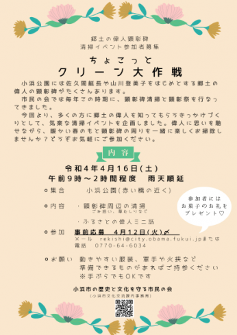 明日、4月16日(土曜日)に予定しております、「ちょこっとクリーン大作戦―郷土の偉人顕彰碑清掃イベント―」について、予定どおり実施させていただきます。