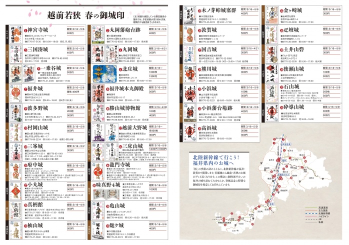お知らせ 春のお城印を発行しました! 後瀬山城、小浜城の春の御城印を発行しました!今回は、北陸新幹線敦賀開業と合わせ、3月16日(土)から5月6日(月・祝)までの間、発行します。限定100枚となりますので、この機会に歴史文化の深い小浜市にお越しください。 更新日:令和6年3月16日 海ノ民話アニメーション「西小川十一面観音菩薩… → »
